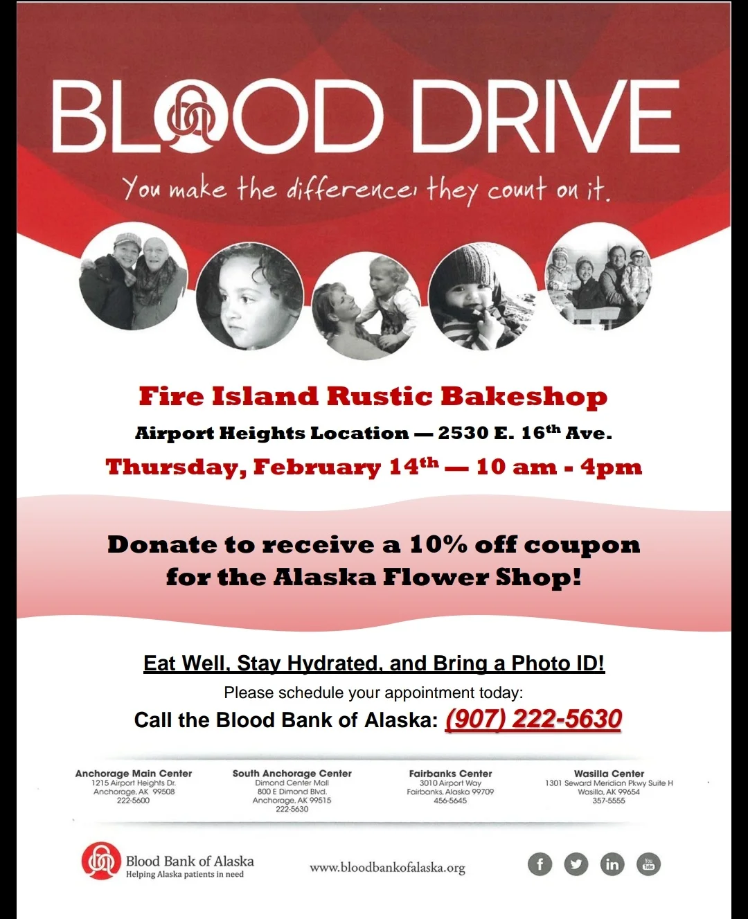 Come visit our Airport Heights location and literally share your heart with someone in need. We are hosting a blood drive from 10am-4pm and with every donation a 10% off coupon for the Alaska Flower Shop will be given.